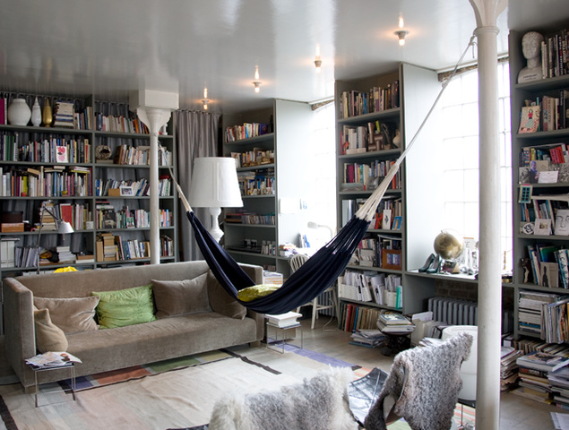 En esta foto es muy interesante el uso de la iluminación, con esas bombillas sencillas en el techo, y el uso de los tejidos para revestir la pared detrás de la estantería.