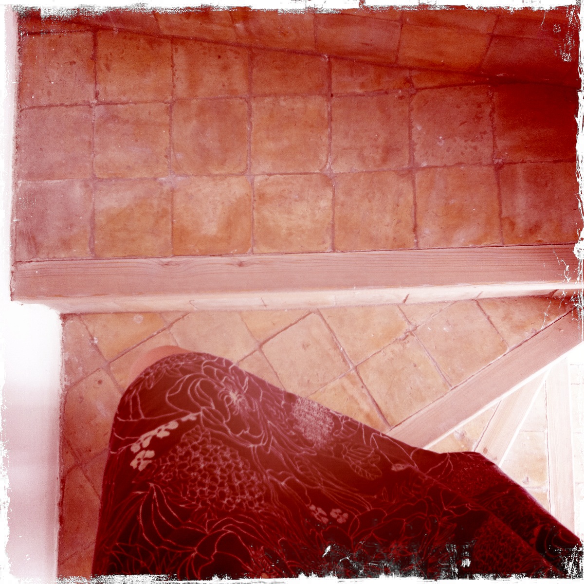 Mezcla de texturas en escalera. Estampado del vestido, barro cocido y madera cruda. Natural y precioso.