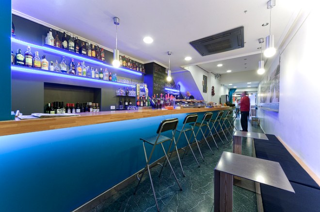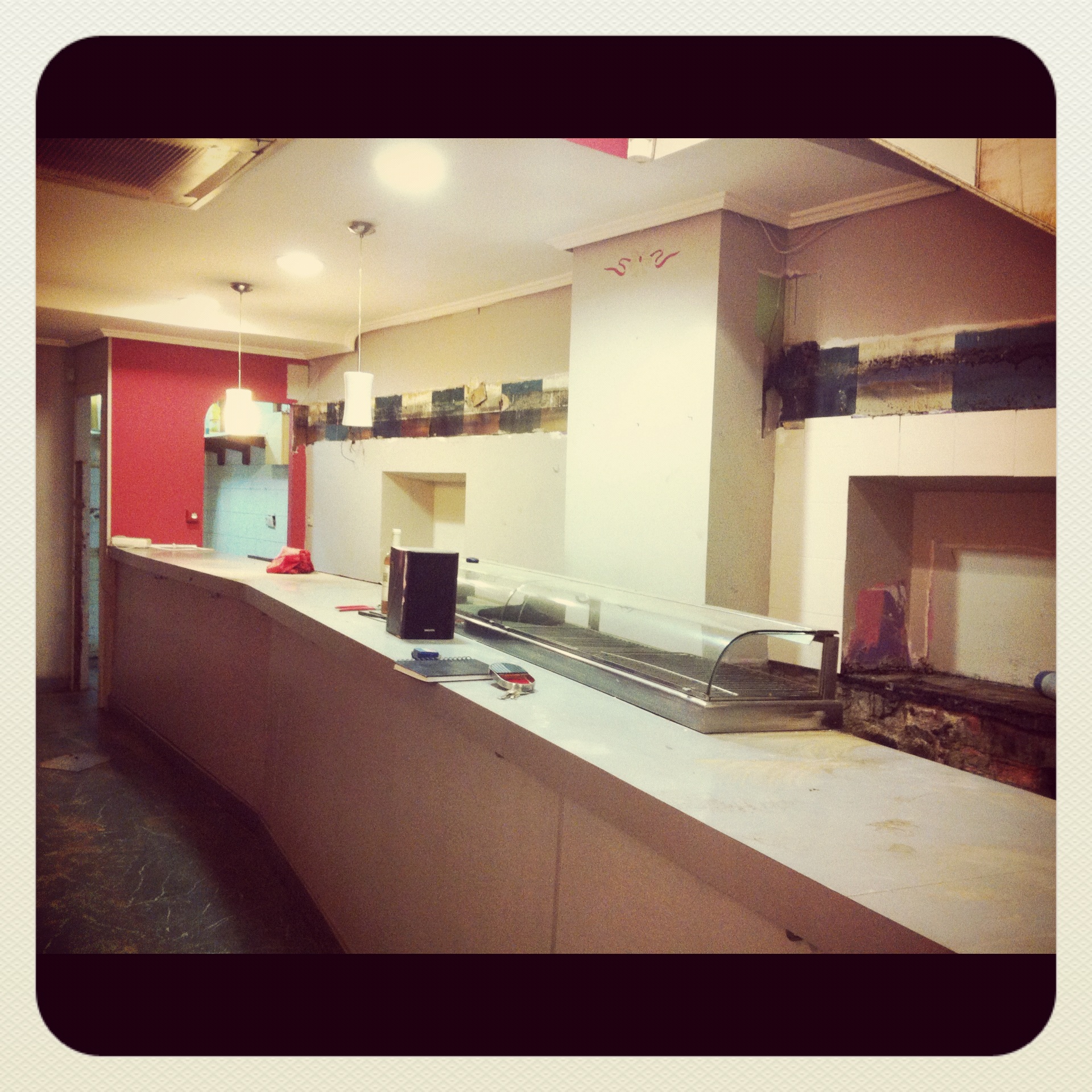 Fue un cambio de imagen, como en el anterior proyecto, se pintaron las paredes, se forró la barra y se añadieron elementos de mobiliario diseñados expresamente. Se eligieron dos materiales principales, la madera de haya barnizada natural para barra y banco corrido y la chapa de hierro doblada, para estantes, barras auxiliares y mesas en zona posterior.