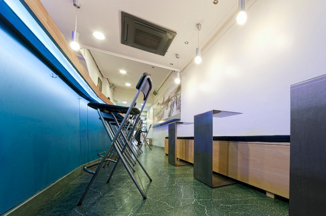 Se pintaron las paredes y techos de blanco, la barra y las luces indirectas se eligieron de un azul intenso, el mismo de las letras del logo.