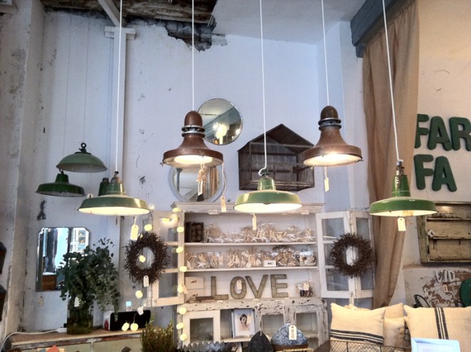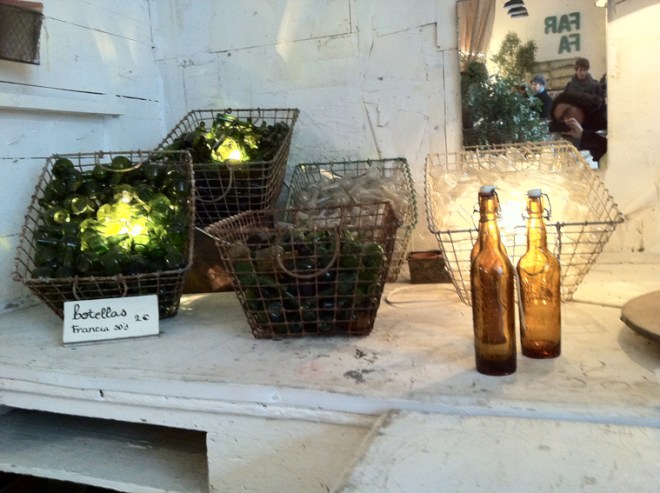 Había muchas lámparas, adornos hechos con materiales reciclados, cubos, botellas francesas y belgas de los años 30 y tipografías de la misma época.