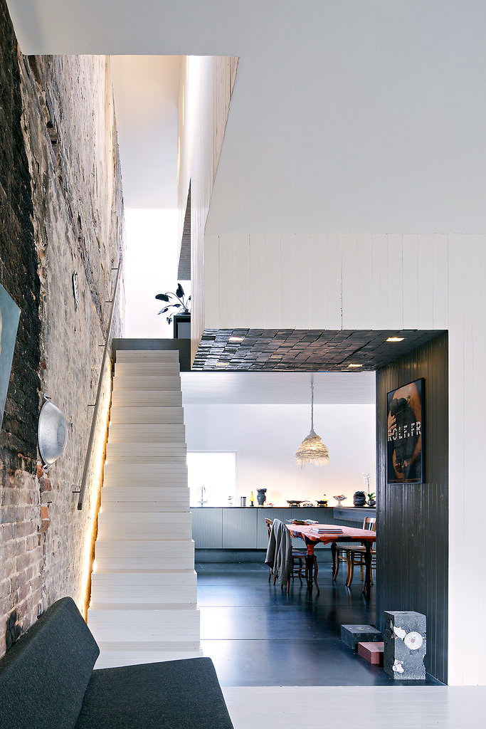 Imagen del comedor desde la escalera. Han coservado los ladrillos originales, la escalera la han separado de estos mediante luz indirecta y la paleta cromática se basa en el blanco y negro con toques de color más intensos y alegres.