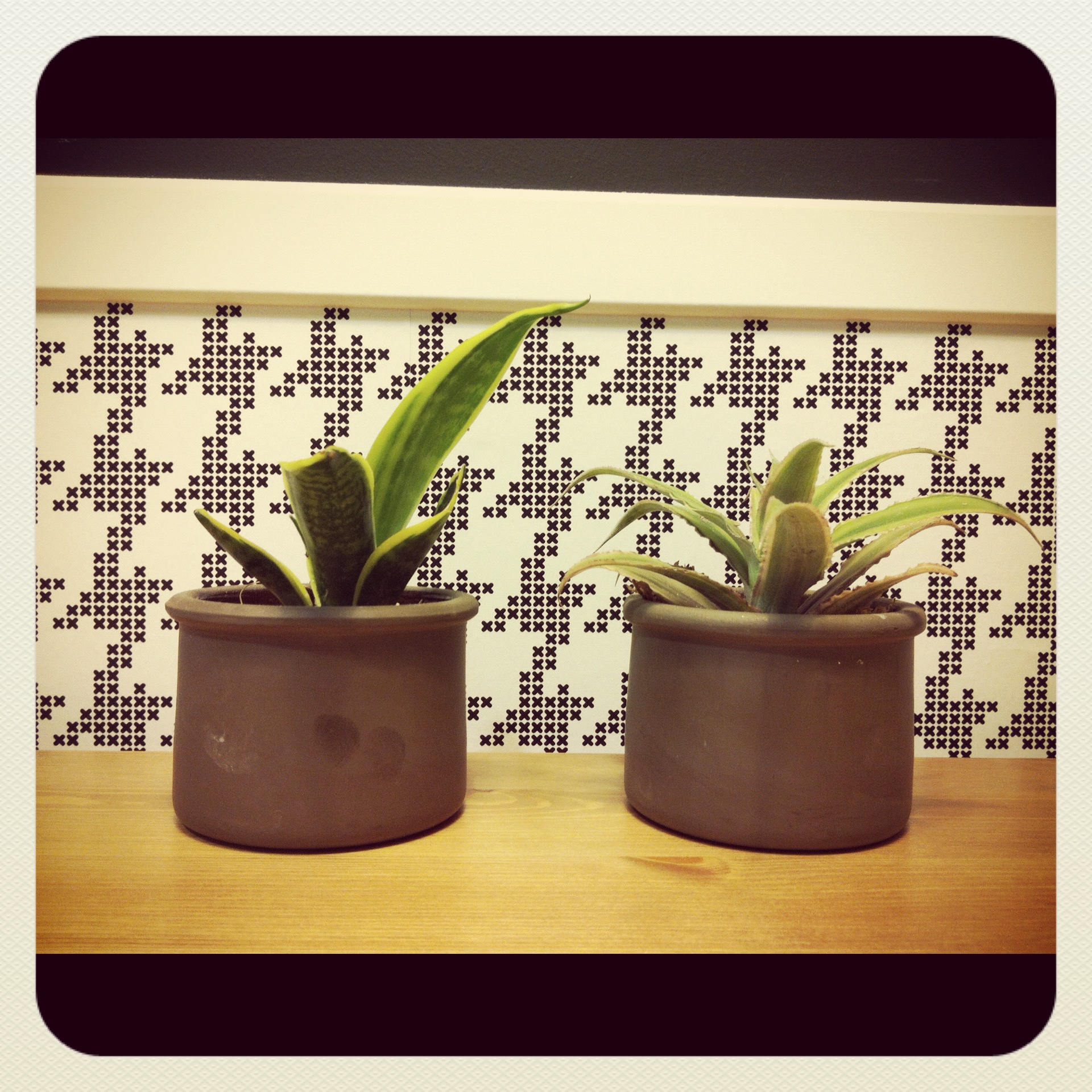 En este detalle del papel pintado se ve que el estampado está dibujado como si fuera en punto de cruz. Hace un efecto curioso de papel-tejido.