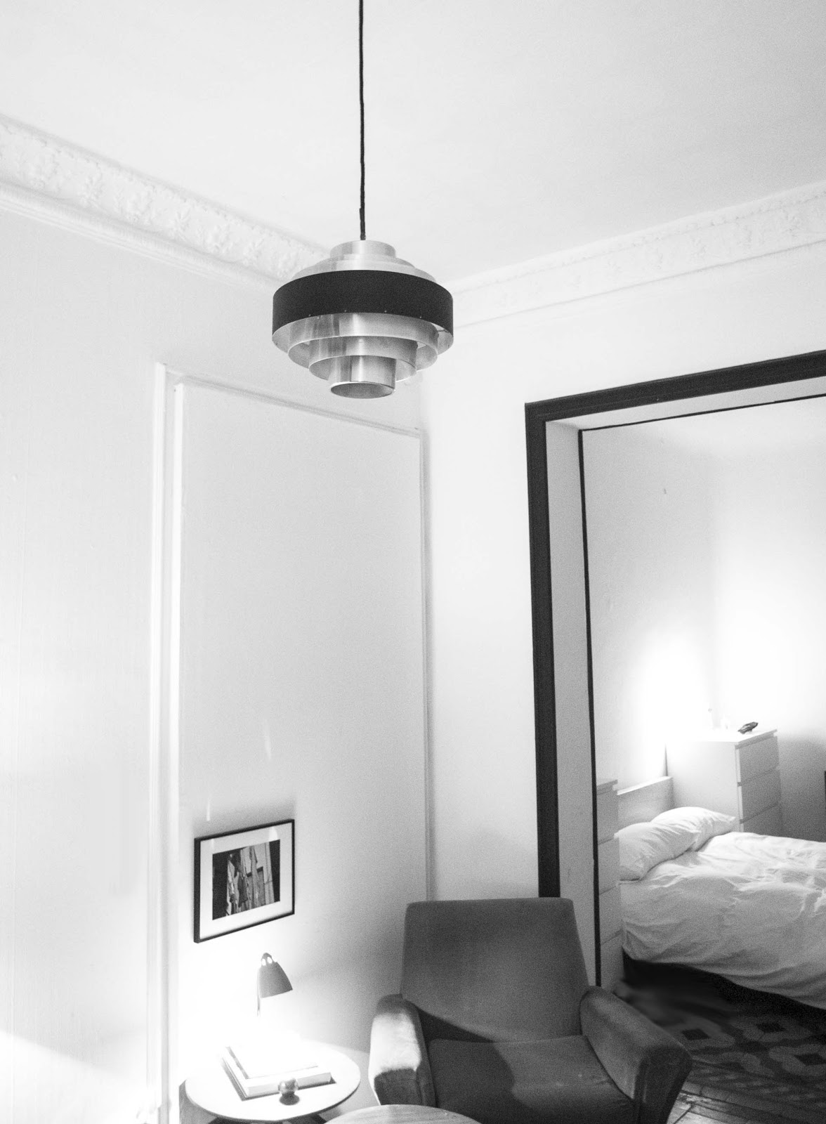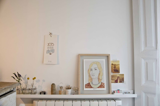 Me gustan mucho los detalles de esta vivienda, los suelos de baldosa hidráulica, el calendario wonder, la bolsa de Merci París en el suelo, lámparas y mobiliario vintage, la casa de Napoleón 🙂