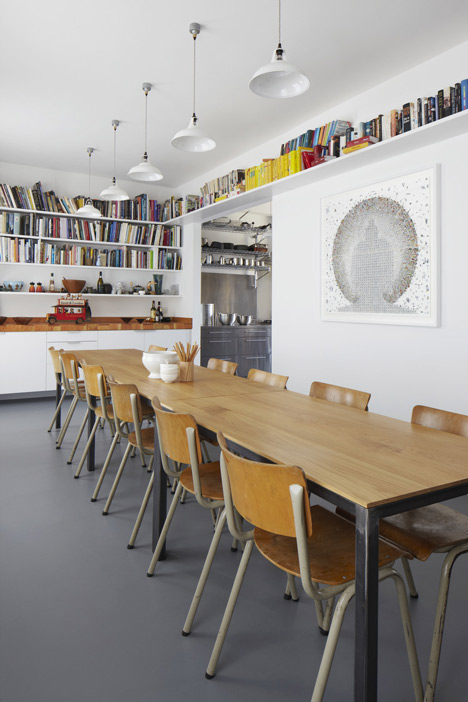 We are visiting a houns in the center of London. It has a big kitchen and a really big dining table, because once a month it becomes the headquarters of a kitchen club. Look at the long shelf, I find it interesting like if it was a plaster molding at the top of the wall. ¿What do you think?