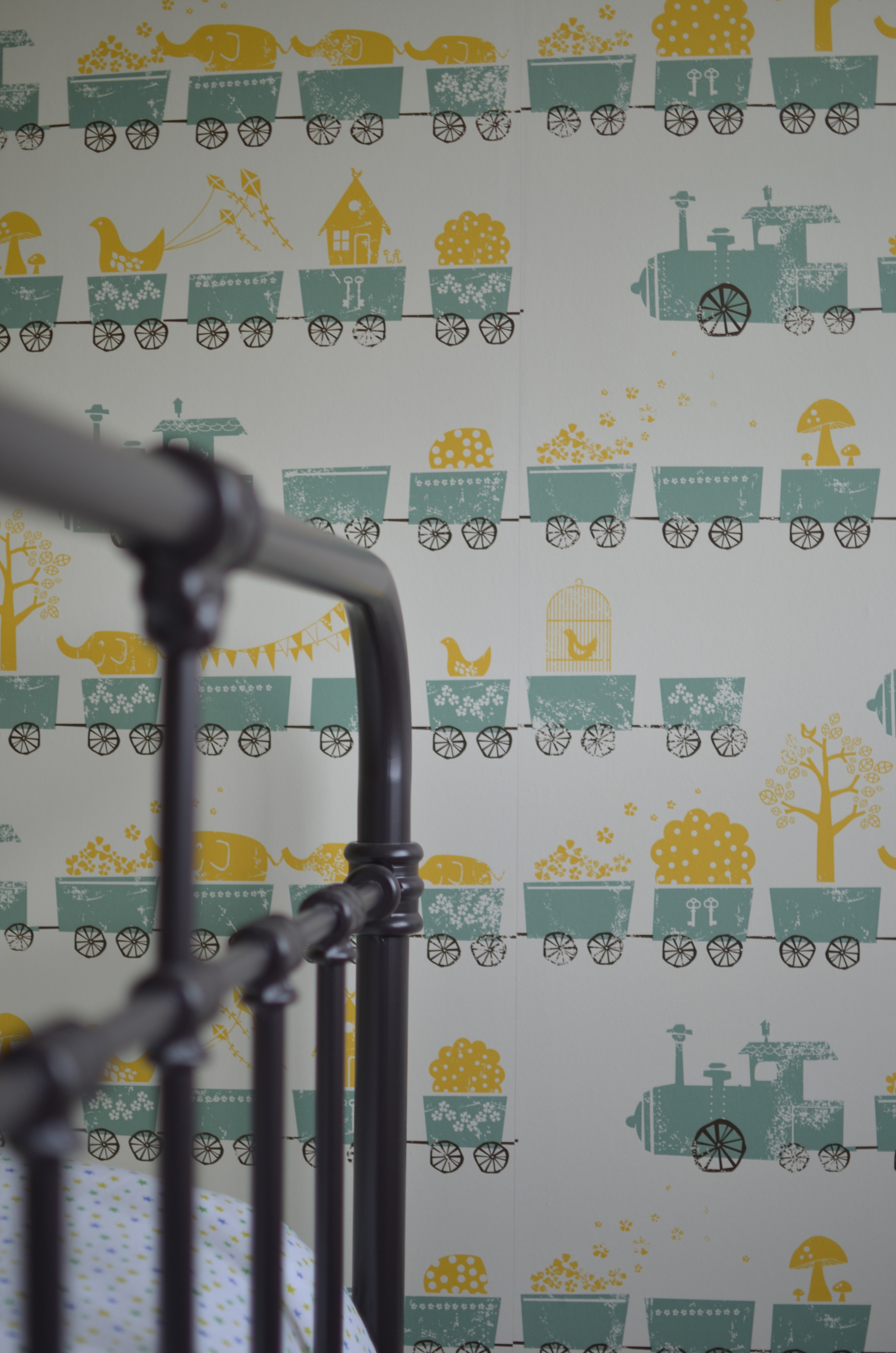 La cama elegida es una de hierro forjado de Maisons du Monde, el papel de Ferm Living modelo Tiny Train.