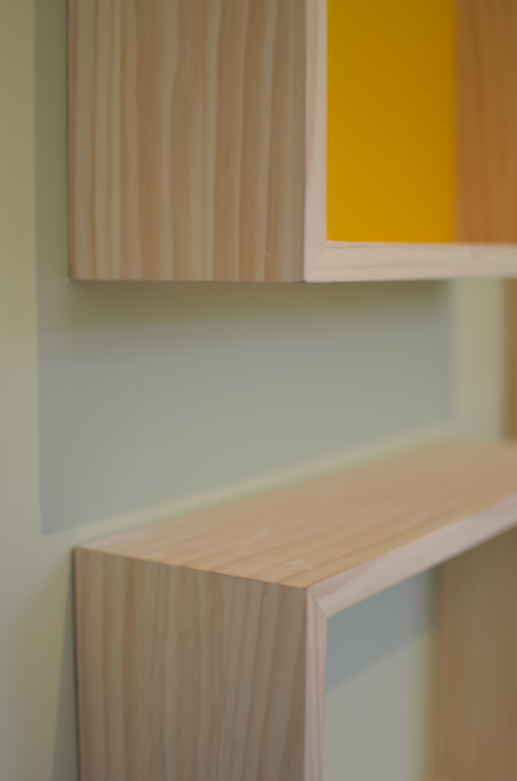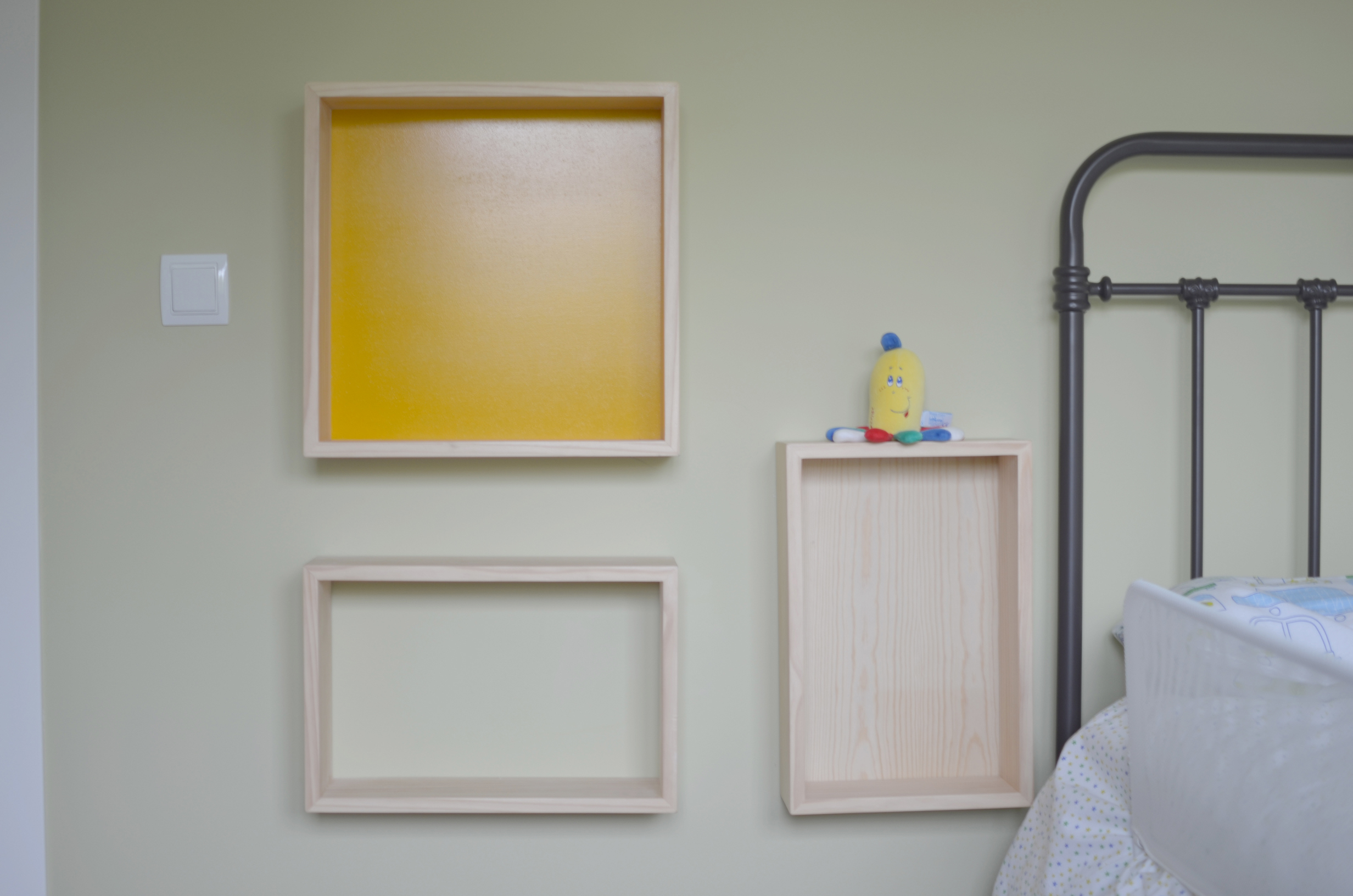 Como mesitas de noche, encargamos a los chicos de Picapino unas cajas a medida y en el color que era adecuado al diseño de la habitación; una de pino entera, otra de pino con la trasera en amarillo anaranjado y la otra de pino sin trasera.