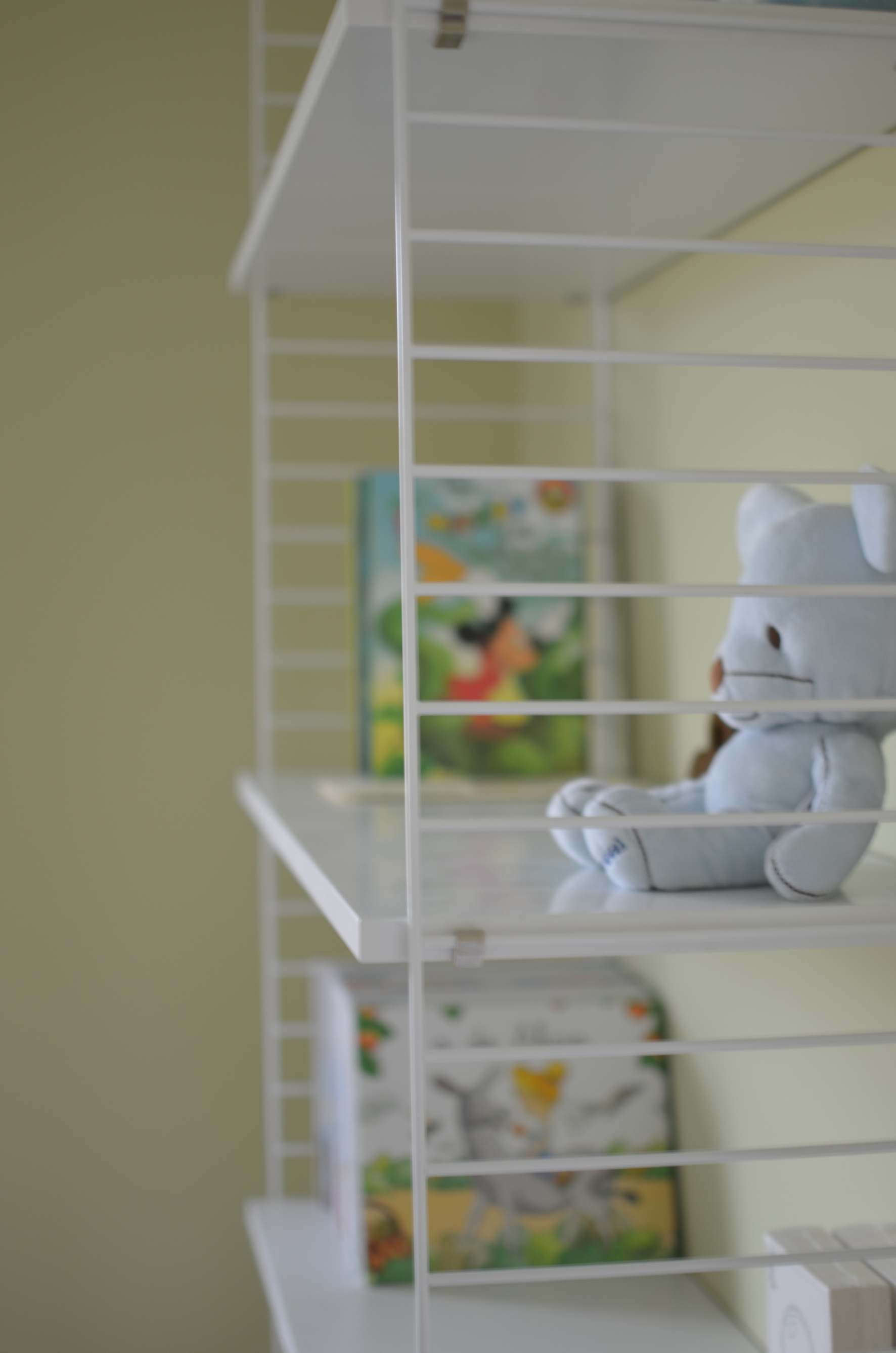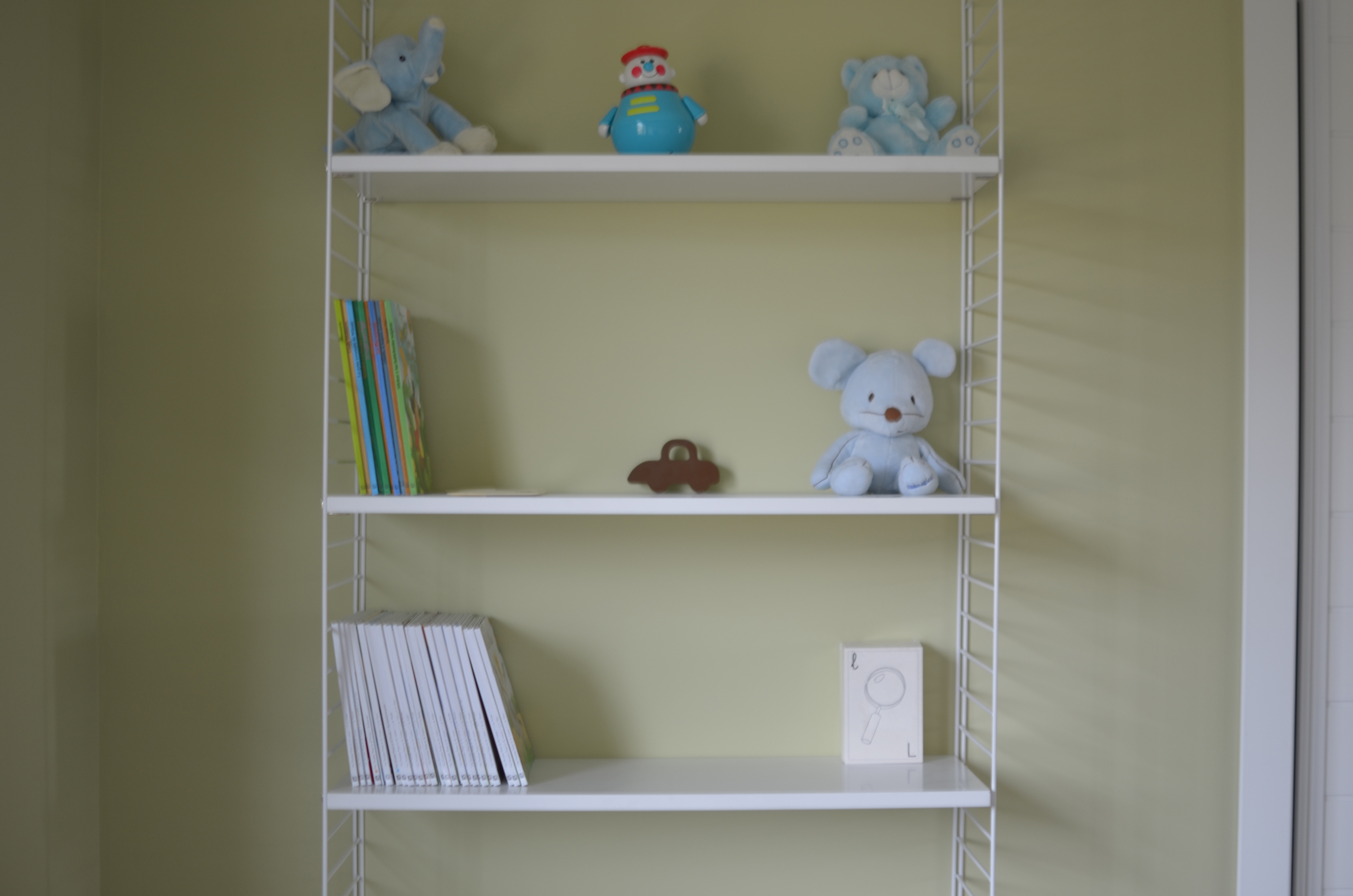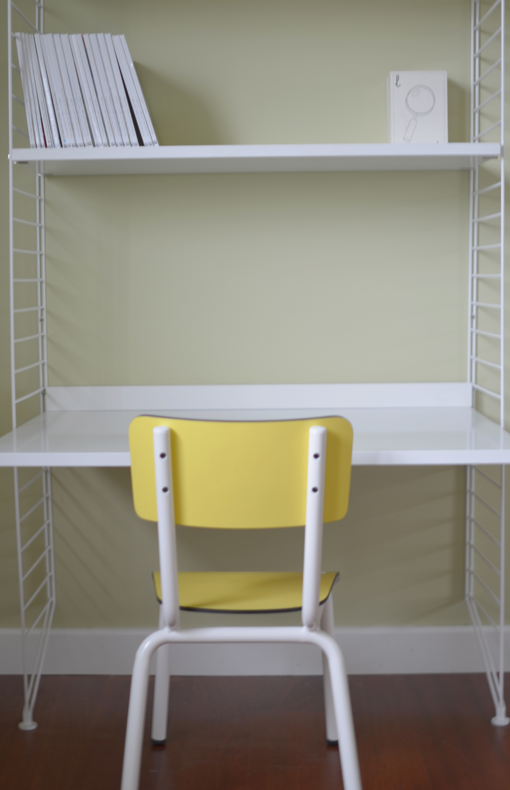 En un lateral de la habitación creamos un rincón para pintar con un módulo de la estantería String y una silla de Les Gambettes junior.