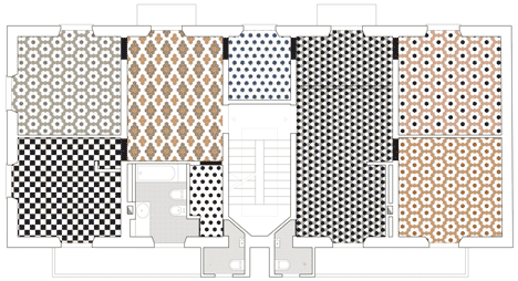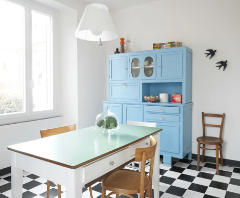 We are going to Italy today, to visit a house with interesting floor tiles. They are the main character of the spaces, as long as the black skirtings and door frames. The furniture is very simple and very little, because of the floor. The white walls are the opposite needed because of the rich colours of the floor.