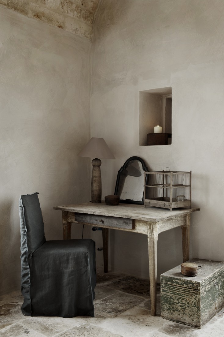 Chimenea en la zona de estar. Los colores son los de la tierra, troncos, maderas antiguas, ramas como decoración.Precioso rincón en tonos tierra, con un escritorio antiguo y su lámpara.Una de las zonas de estar decorada en tonos fríos, azules, malvas, grises.Otra zona de estar algo más cálida en tonos tierras, verdes y cremas.Detalle del dormitorio, decorado con elementos más confortables, como el cabecero tapizado, suave. En este caso se ha optado por colores malvas y azules, muy relajantes.Vista general del dormitorio, con el cabecero tapizado y las lámparas simétricas.Detalle de la consola de madera decapada blanca.Detalle de las texturas de las maderas. En esta casa se han utilizado maderas decapadas, recuperadas, todas con una pátina preciosa. Como decimos siempre. son los detalles lo que hace acogedor un interior.Rincón del dormitorio, con la armonía de los colores malvas y tierra. Como veis, aquí también aparece la ramita de olivo.