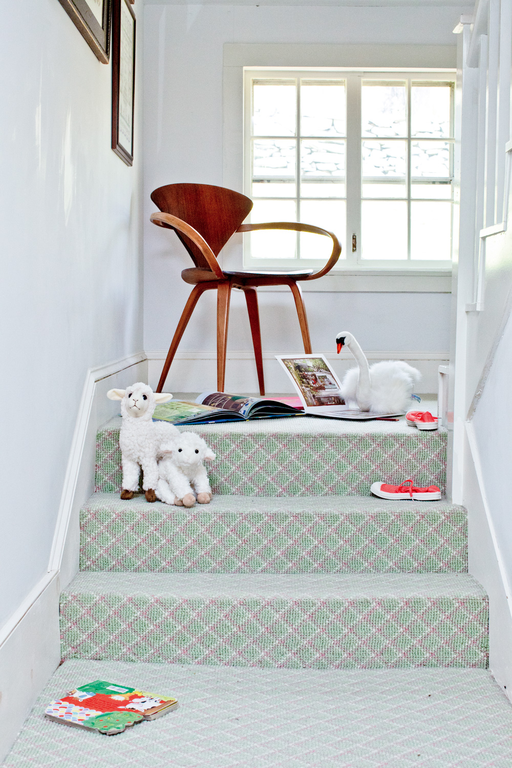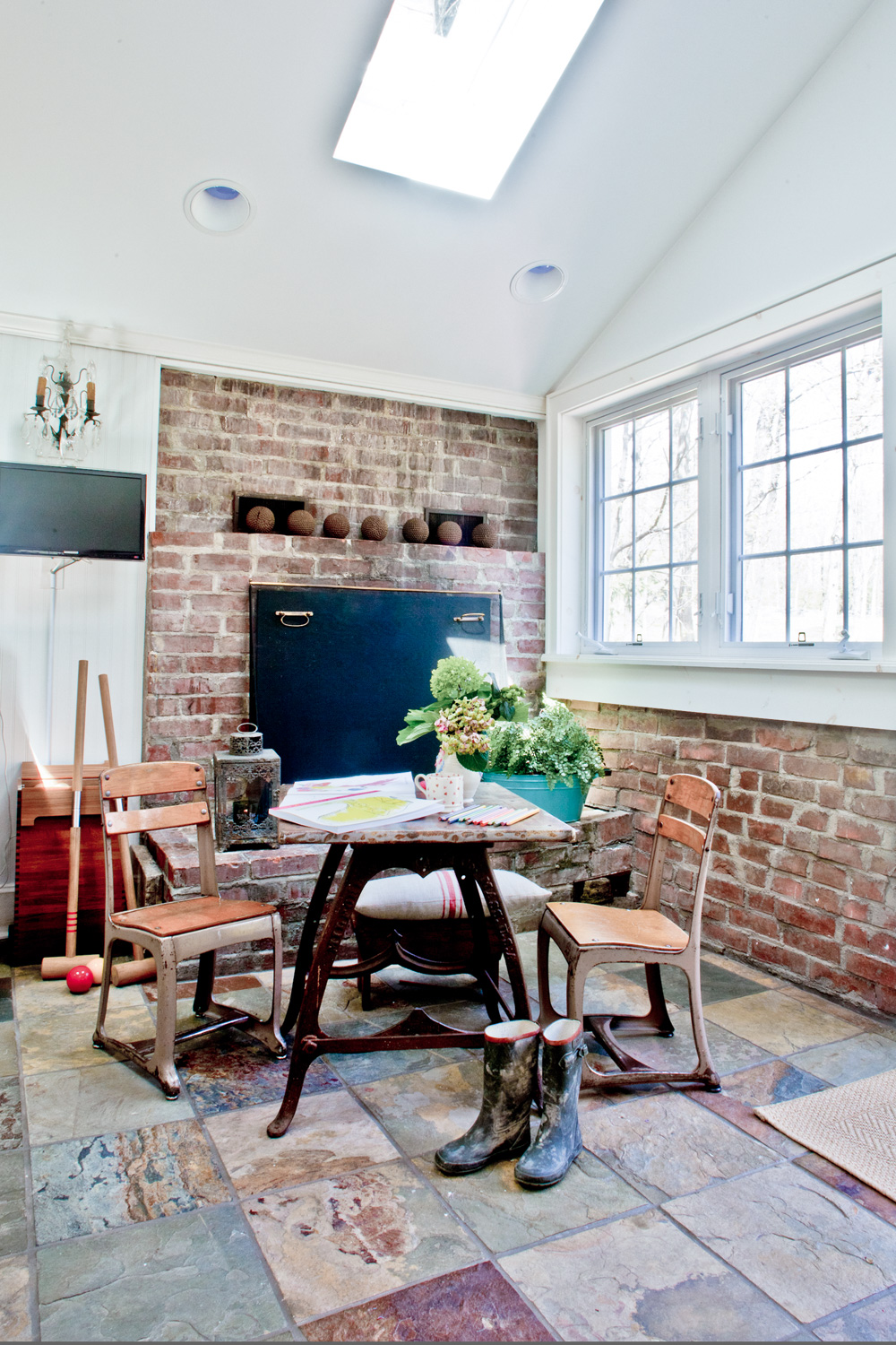 Durante 5 años estuvieron realizando la reforma de esta casa. Cuidaron todos los detalles, eligieron cada pieza de mobiliario y decoración, buscaron sus muebles por mercadillos, brocantes, ventas de garaje. Destacaría detalles como la elección del papel pintado de la habitación infantil, la combinación con la pintura blanca de carpintería, rodapie, molduras… para suavizarlo, el suelo pintado a modo de damero, el maravilloso suelo recuperado, la zona del hogar con ese fantástico ladrillo cara vista, el estar con el sofá Chester y la bella lámpara Jieldé.