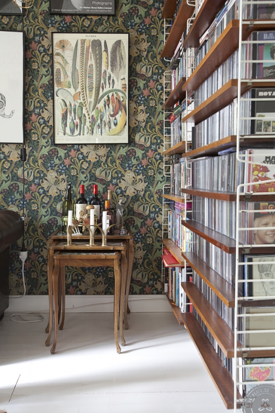 Textura de azulejo y ladrillo visto en la cocina.Detalle del papel pintado del dormitorio principal.Estampado en el papel pintado.Debajo de la escalera se utiliza un papel pintado con un dibujo grande, combinado con otro tipo de telas y la piel gastada del chester.Papel pintado en la habitación principal.Varias tiras de diferentes papeles pintados en el dormitorio infantil.Textura que forma la estantería String, los libros, los discos.Texturas en el suelo, en la pared, en el fondo.