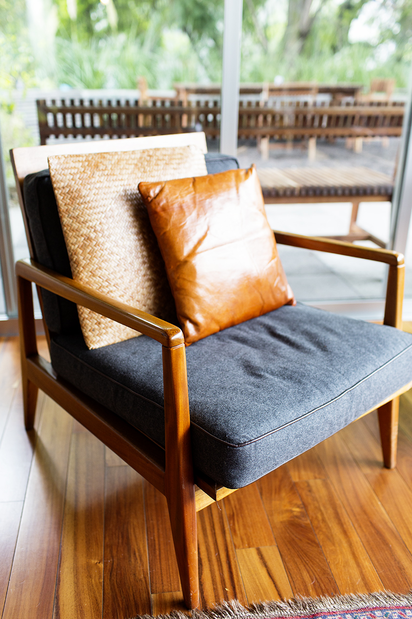 Espacios interiores-exteriores llenos de vegetación y de luz.Parte exterior de la vivienda.Comedor de la vivienda.Zona de estar. Las ventanas son de grandes dimensiones, casi un paramento transparente.El mobiliario de la vivienda también es el típico de la época, tapizado en telas y colores lisos.Los paramentos oscuros con mobiliario hecho a medida y alfombra clara es una constante que se repite.Zona infantil de la casa. Separó la vivienda en usos y construyó un pabellón infantil con zonas de juego, lectura, trabajo y descanso.Dormitorio infantil en el pabellón dedicado.Detalle de librería infantil, muy parecida a la librería String.Zona de estudio en la habitación infantil, con la pared de vidrio que ilumina toda la estancia.