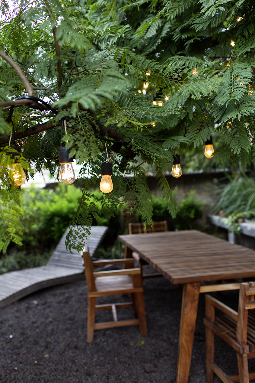 Los propietarios en su cocina.Colección de cuadros sobre un aparador.Elementos decorativos.Dormitorio infantil con falsa taxidermia en cartónVista general del salón y jardín.La terraza se amuebla con unas mecedoras de los Eames.Rincón del té.Preciosa iluminación del jardín.Butaca años 50.Cactus.Detalle del patio.