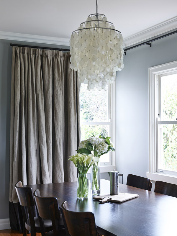 Zona de estar con un maravilloso espejo de sol, una chimenea encastrada en la pared y un papel pintado en la esquina que da su toque a este espacio de elementos sobrios.El comedor es un espacio elegante decorado con colores sobrios también. Destaca la lámpara de nácar de Panton y las impresionantes cortinas de lino (el lino en cortinas es un must!)La decoración de platos de un rincón del comedor da su toque de alegría a este espacio tan sobrio.Un rincón del estar.