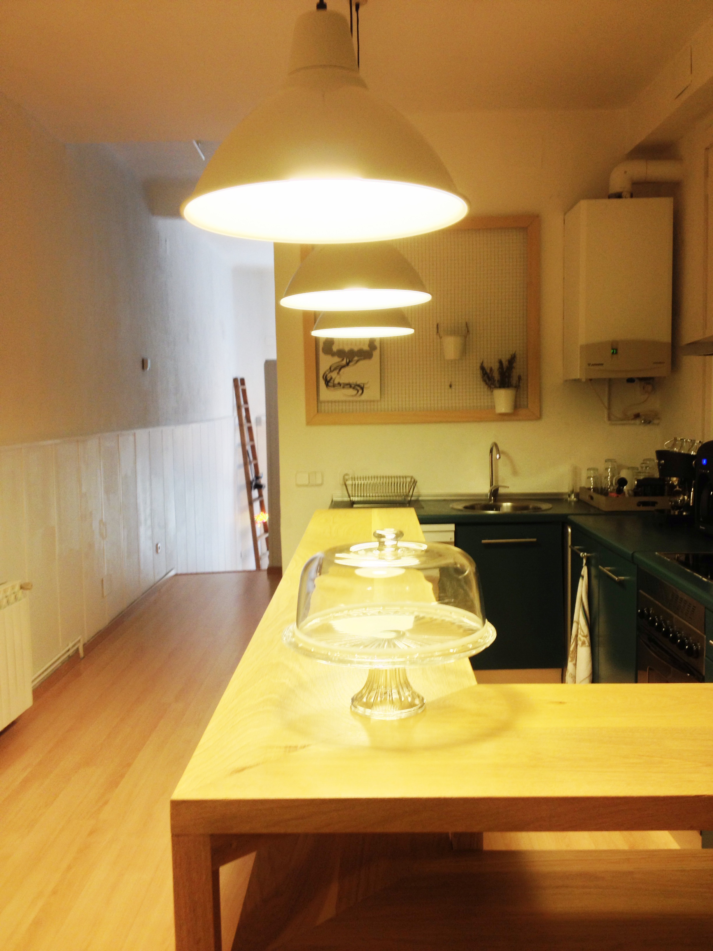 El local está dividido en tres plantas; la de acceso que os he mostrado, la entreplanta, que es donde vamos a dar los talleres en una maravillosa mesa de roble macizo blanqueado, que también tiene una cocina para hacer los desayunos y meriendas de los talleres; y un sótano para otra clase de eventos y cursos.