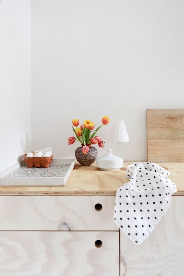 Almacenaje debajo de una cama elevada con tablero fenólico. Inspiración para un proyecto donde la clienta quería guardar objetos voluminosos sin perder espacio libre para una cama y una mesa de estudio.La cocina es muy sencilla, con mobiliario hecho a medida a base de tablero fenólico acabado en una madera muy clarita, tipo arce o fresno. El aparador blanco es genial.Detalle del alicatado de la cocina. Nosotros en las propuestas de reforma aconsejamos alicatar sólo hasta una altura. Me encanta el resultado. Fijaos en la bombilla como de obra en la parte derecha.Detalle del precioso mostrador de la cocina. Los objetos sencillos y bien hechos decoran este espacio.Las vajillas desparejadas, tendencia absoluta este invierno y de cara a primavera.El estudio es un espacio muy luminoso, amueblado con elementos blancos y de la misma madera clara fenólica.Otra foto del estudio con un mueble bajo la ventana, recurso que me encanta cuando es posible, ya que los radiadores suelen estar ahí.Detalles de la decoración en la vivienda.Precioso aparador de aire nórdico de los 50 que queda genial en este ambiente. Precioso también el suelo desgastado y tratado al aceite.
