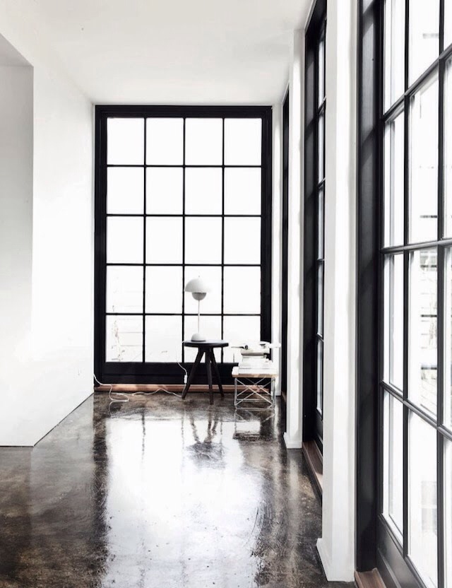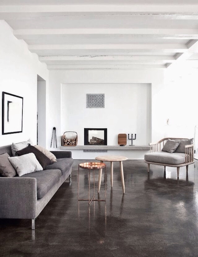 En las imágenes podéis ver la mezcla de mobiliario de diseño clásico de aire minimalista, como las sillas Wishbone de Wegner, los elementos fabricados en cobre, que dan calidez al interior y además son tendencia (ese panel que cubre la pared del baño!) y el suelo de cemento pulido y barnizado gris cálido. Todos estos elementos dan al conjunto un aire de Minimalismo cálido.