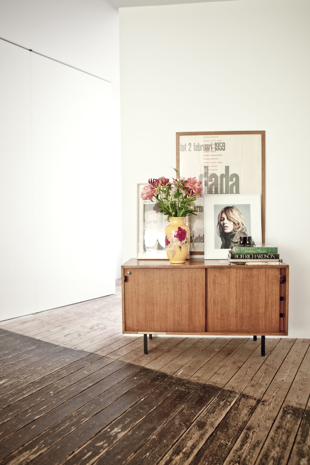 El comedor luminoso está compuesto por piezas de distintas épocas.Detalle de la zona de estar.En el dormitorio infantil podemos ver soluciones creativas como este armario sin puertas.El colchón se apoya en el suelo en el dormitorio principal.Preciosa estantería de madera diseño de Hay.Zona de estar con mezcla de elementos de diferentes épocas, años 50, 80, …En la cocina nos encontramos una isla que parece hecha a mano.Detalles de composición en rincones. Un aparador nórdico con flores, fotografías, pósters…