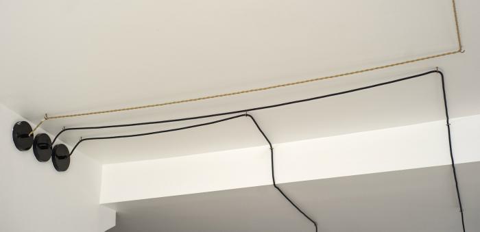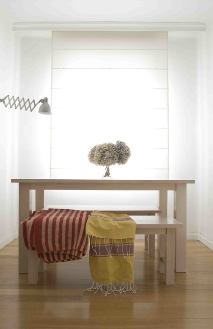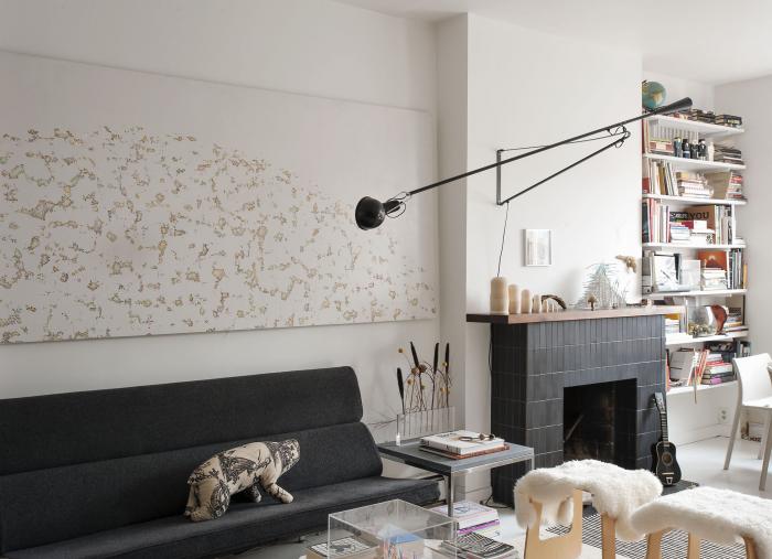 A continuación nos encontramos con la zona de estar, sobre el suelo recuperado y pintado de blanco. Algunos muebles son encontrados en la calle, como la silla amarilla, otros recuperados, como los taburetes de Ikea, antiguas mesitas de la dueña. Las obras de arte que cuelgan en la pared son de amigos y los elementos decorativos, flores, ramas, piedras, son resultado de los paseos de la arquitecta. Un recurso decorativo que queda muy bien (bien hecho, de lo contrario queda horrible) es llevar las lámparas a la situación adecuada con el cable por el techo. Tiene que estar muy bien planteado, el cable recto, los colores muy bien elegidos (como este ejemplo perfectamente hecho, el hotel Michelberger)