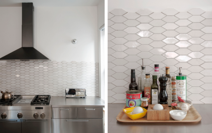 La vivienda tiene una planta alargada; en un extremo se encuentra la cocina y en el otro el comedor aprovechando así la luz. En el centro está la zona de estar. En la cocina no se ha alicatado la pared hasta el techo, sólo en las zonas en las que es necesario, y no se ha rematado el azulejo, se ha dejado el borde irregular del diseño elegido.