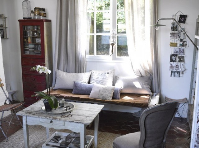 Las sillas de bistrot francesas, flores, mucho vidrio, cestería, telas de saco, de lino, cajas de fruta, loza blanca …