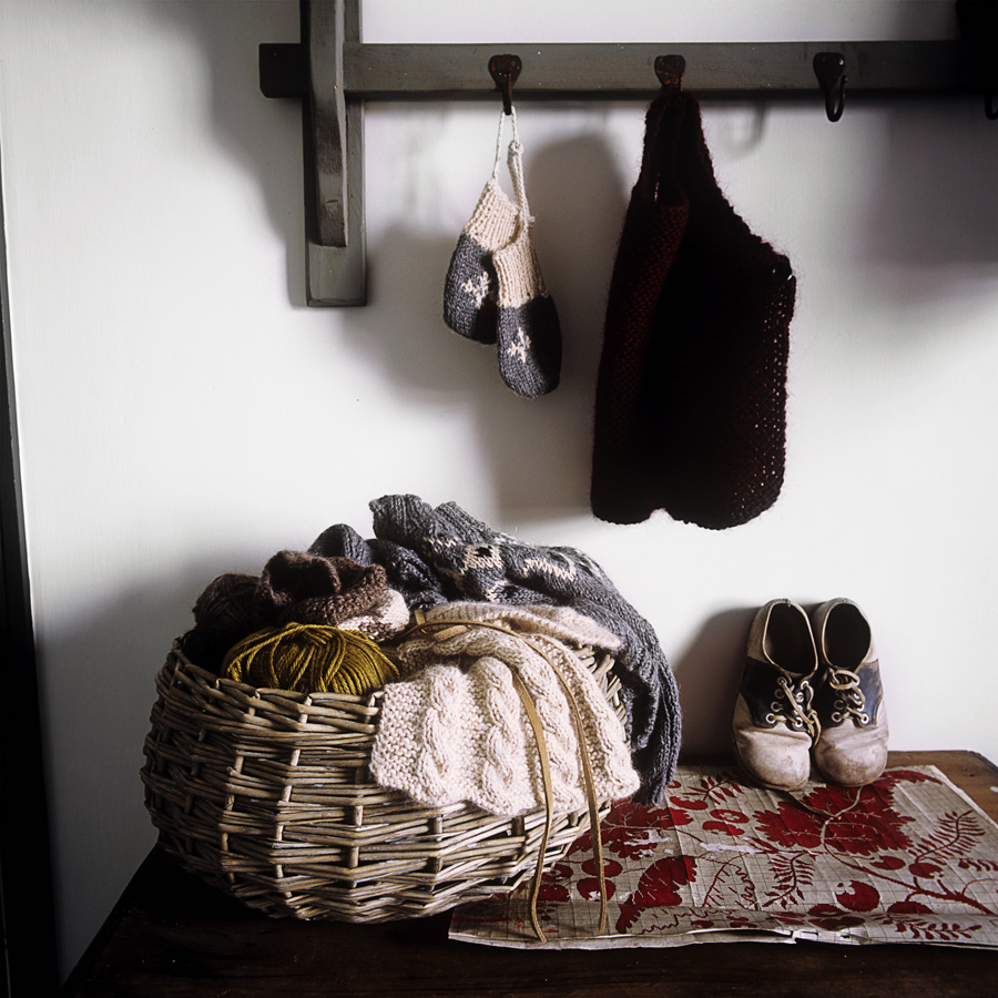 La cocina está fabricada con madera reutilizada, conformando los muebles, estanterías, etc… Me encanta el armarito cerrado con una cortina!El dormitorio infantil se ha decorado con elementos recuperados y otros de nueva construcción pero con materiales reutilizados. Me gusta mucho la combinación de colores verde apagado y rojo para el dormitorio infantil.El dormitorio principal está decorado en tonos malva y azules, muy adecuados para la introspección y el descanso.Jardín trasero de la vivienda, con el césped estupendo tan propio de los jardines ingleses.Piezas de lana que teje Anna, la propietaria. Hace ropa para niños de lana a mano.Porche de entrada a la vivienda. Es una casita blanca con los marcos en azul cobalto precioso y muy llamativo.