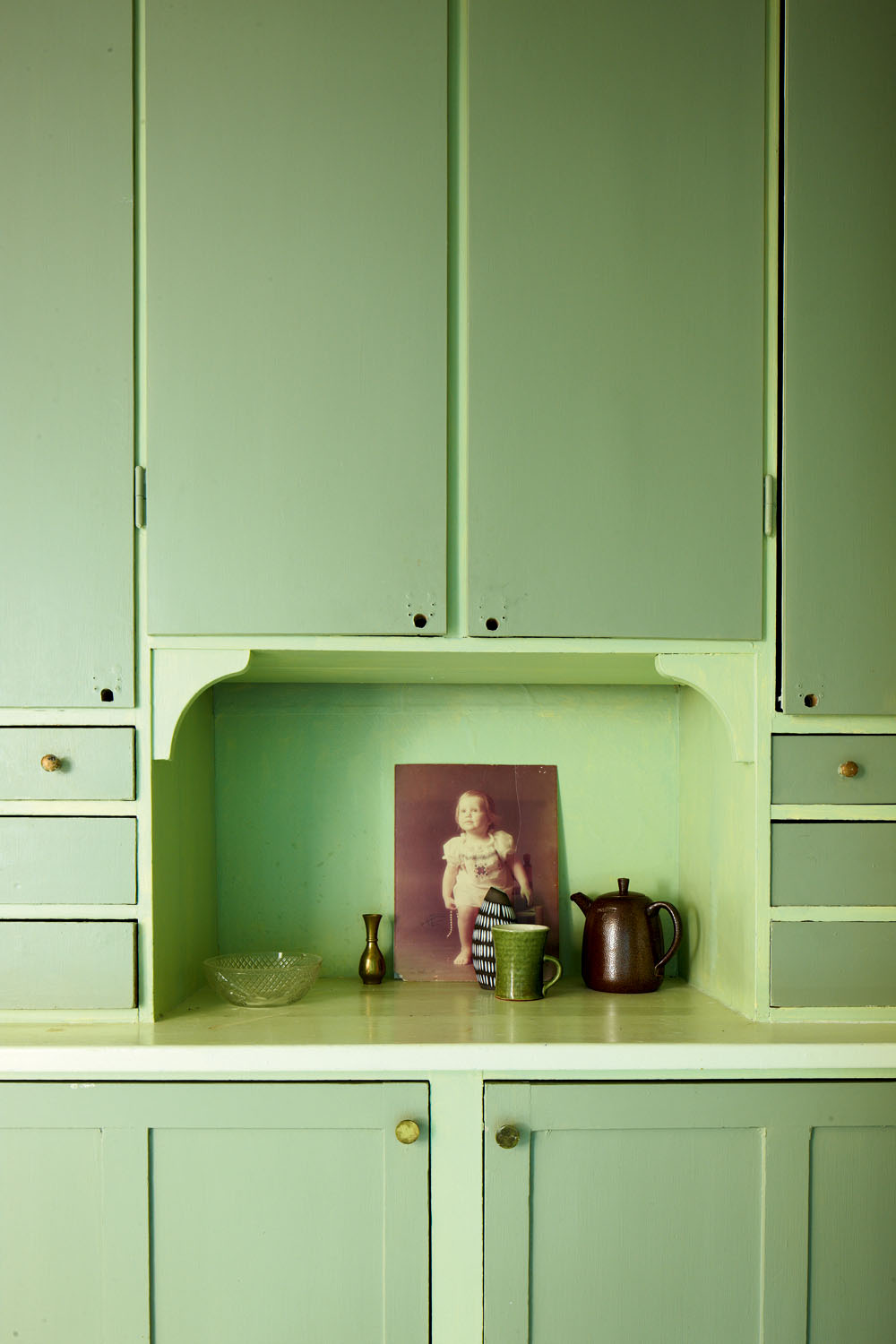 Estar con mueble de espejo donde se refleja el suelo de espiga de roble / Living room with a mirror covered unit that refelcts the beautiful oak floor.Lámparas / LampsCocina abierta con mezcla de estilos y elementos / Open kitchen with a mix of elements and styles.Chimenea antigua con bola de espejos /Old fireplace with a mirror ballPrecioso dintel pintado de azul, detalle sorprendente / A surprising and beautiful lintel painted in bluePared oscura como telón de fondo de la composición de elementos gráficos / Dark wall like a curtain to show the graphic elements composition.Composición de rincón / Corner composition