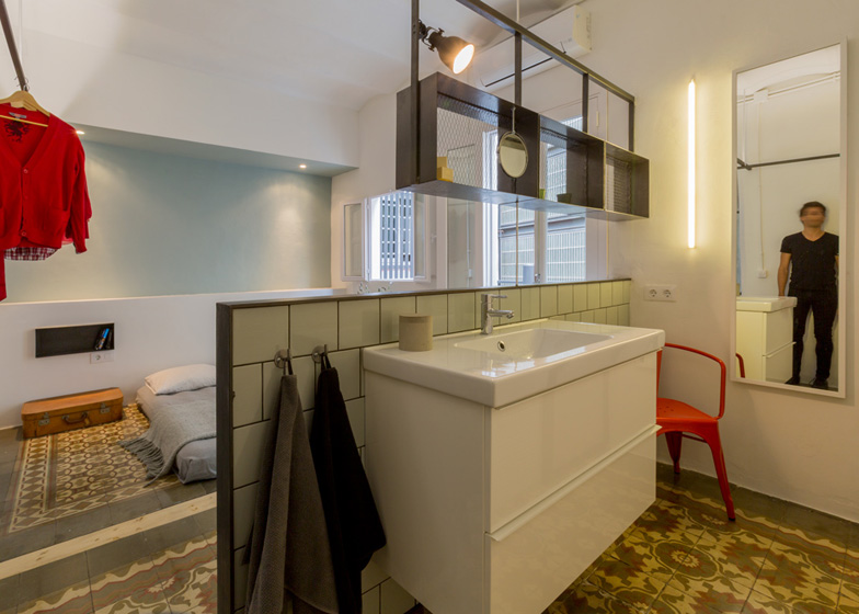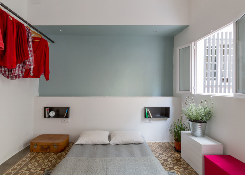 El espacio que ocupa el dormitorio es igual; la cama se ubica en una entreplanta y se aprovecha el espacio inferior para colocar un vestidor, separado del resto del espacio con una cortina tupida. Me parece que queda genial y que los tejidos se deberían utilizar más. El espacio que queda libre se puede ocupar con varios usos, como estar, estudio, etc… En los planos veremos varias opciones de uso de este espacio.